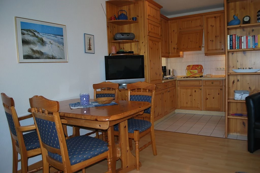 Die Wohnung Nordlicht liegt im Erdgeschoss zum grünen Innenhof hin. Hier lädt ein Balkon zum Entspannen ein. Die Wohnung verfügt über ein modernes Badezimmer, ein Schlafzimmer und ein Wohn-/Esszimmer mit offener Küche. Das Schlafzimmer ist mit getrennten Betten ausgestattet, das Wohnzimmer verfügt über 1 Schlafsofa für 2 Personen und 1 Couch. Der Laminatboden unterstützt die wohnliche Atmosphäre der ganzen Wohnung. Auch ein Essbereich für vier Personen findet hier Platz. Die offene Echtholz-Küche lädt zum abendlichen Kochen ein.